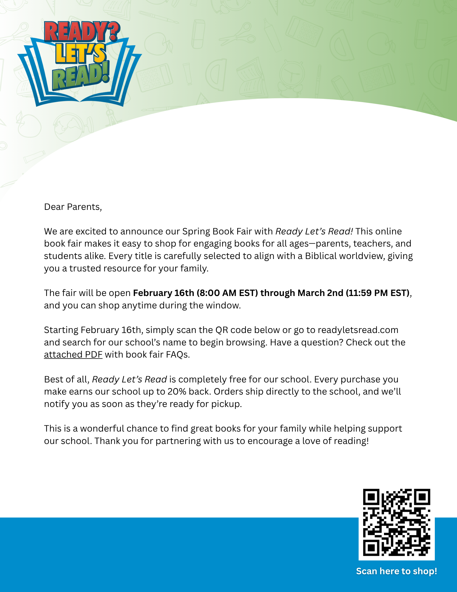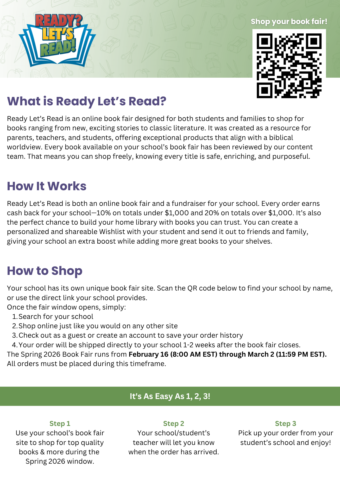 Ready, Let’s Read is an online Christian book fair and fundraiser in one! Founded with a mission to provide a book fair that’s easy to manage and rooted in a Biblical worldview, Ready Let’s Read takes the guesswork out of selecting appropriate books for your students. We carefully curate a collection of hundreds of titles for the whole family. Ranging from beloved classics to exciting new releases, we ensure they align with your values and are books you can trust.