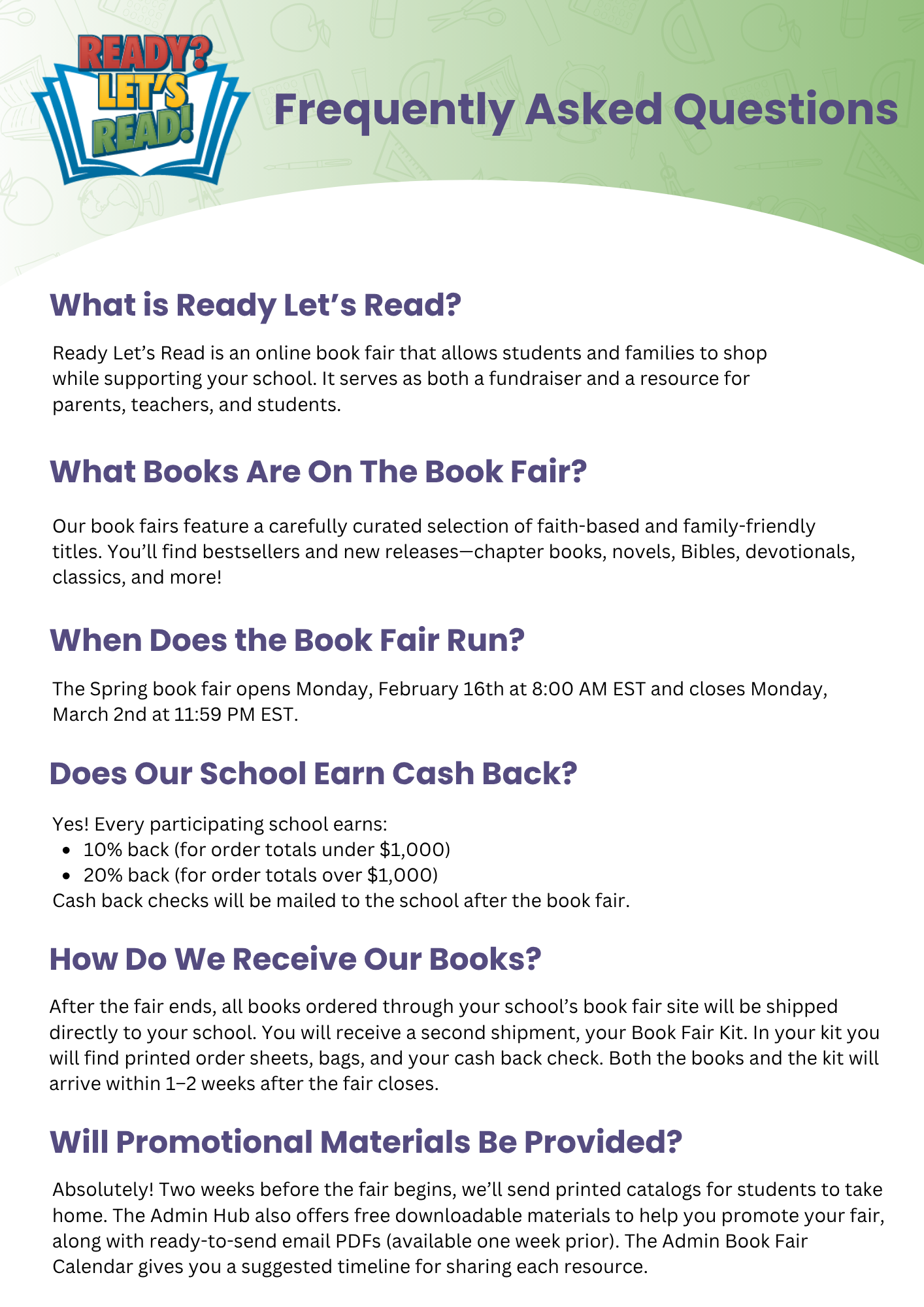 Our goal is to help you feel confident running your Ready, Let’s Read book fair. The admin hub is your home base for all tutorials, explanations, promotion materials, and more!